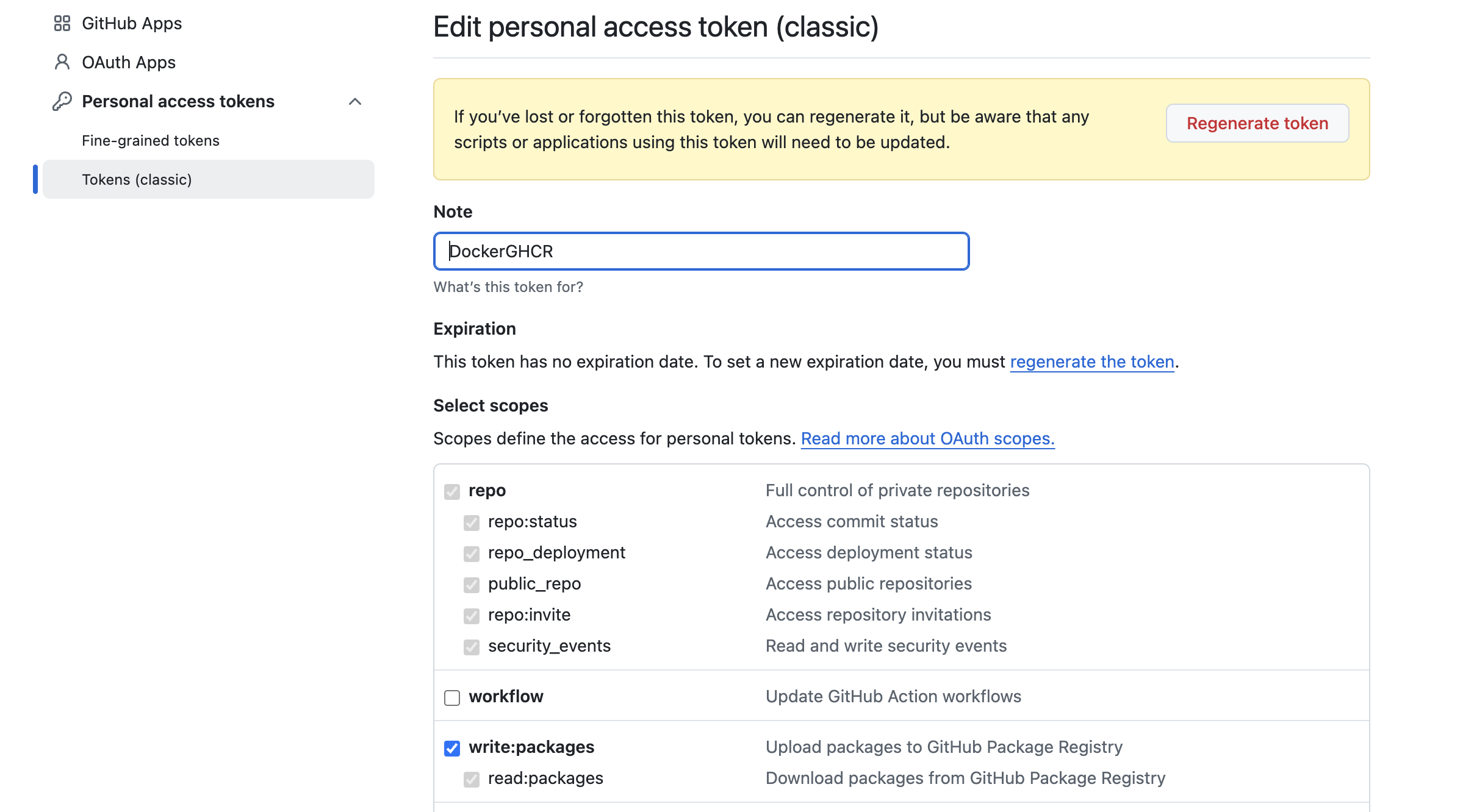 3) Note는 제목이니까 아무렇게나 짓고, repo와 write:packages를 모두 누른다.