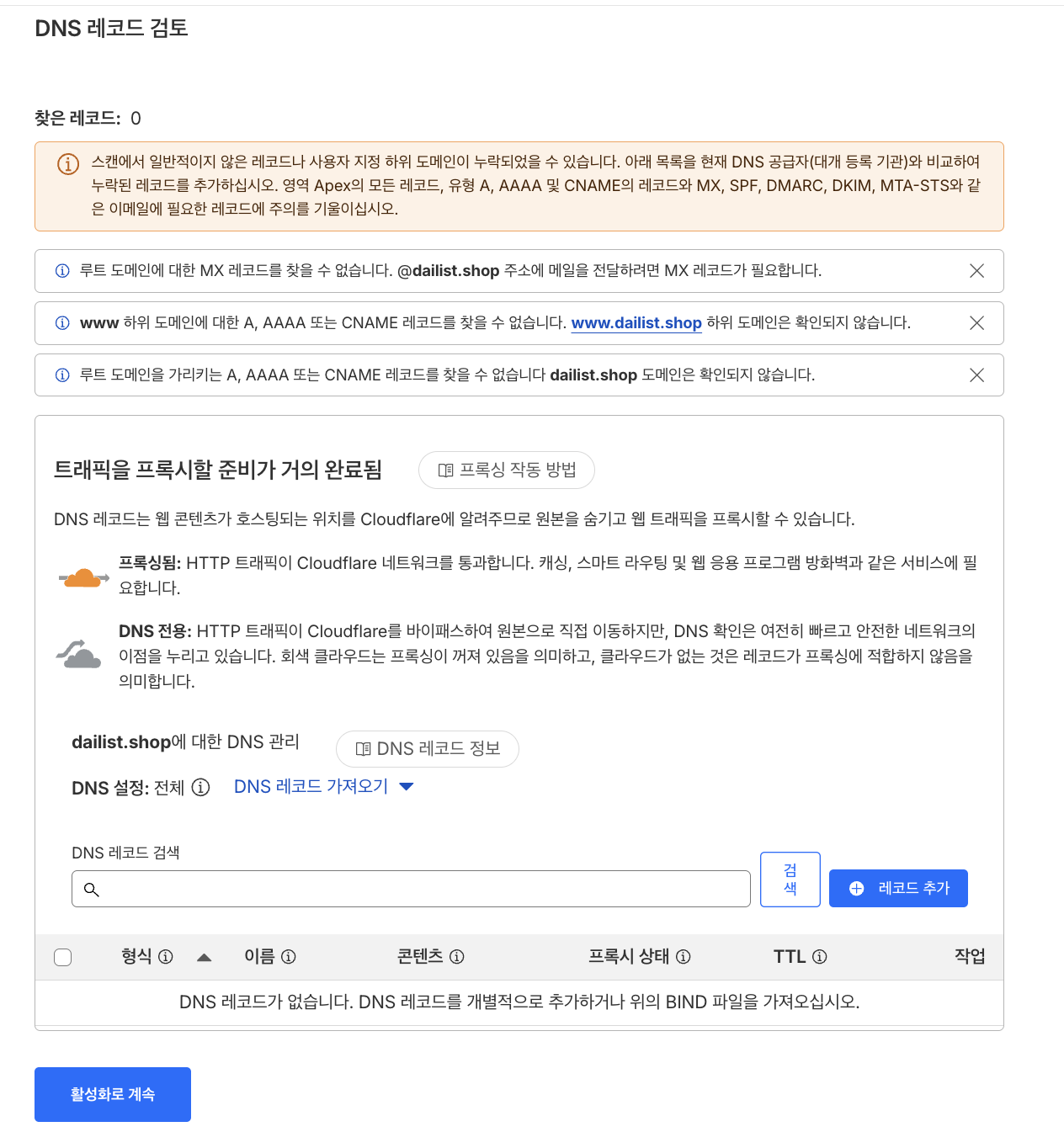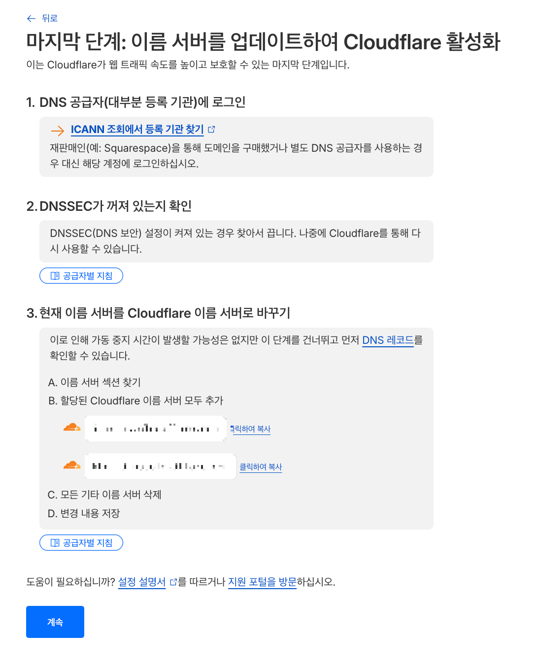 - 그 다음 "계속"버튼을 누르면 네임서버 확인까지 5-10분 걸리고, 그 다음 "빠른 시작 가이드" 같은게 뜨면 끝이다.