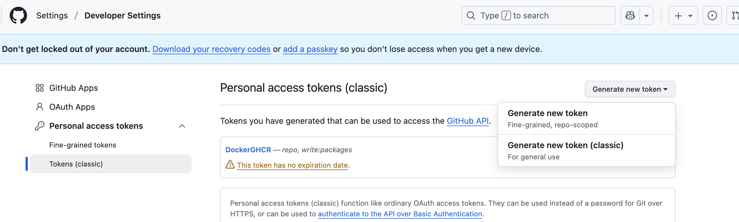 2) Personal access token에서 Tokens(classic) 버튼을 누른 후 우측에 있는 [Generte new token]을 누른다. 그 다음 Generate new token (classic)을 선택한다.