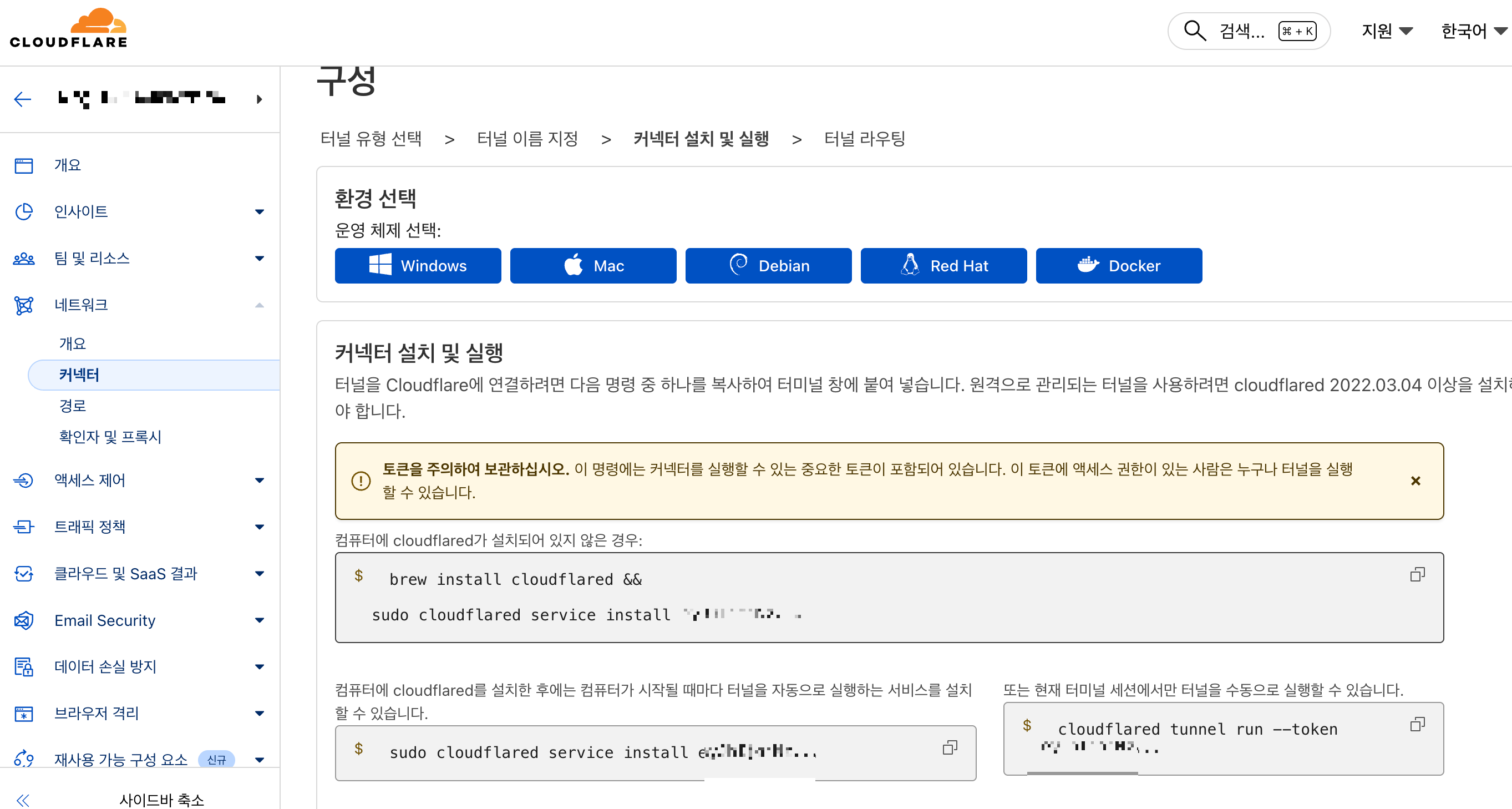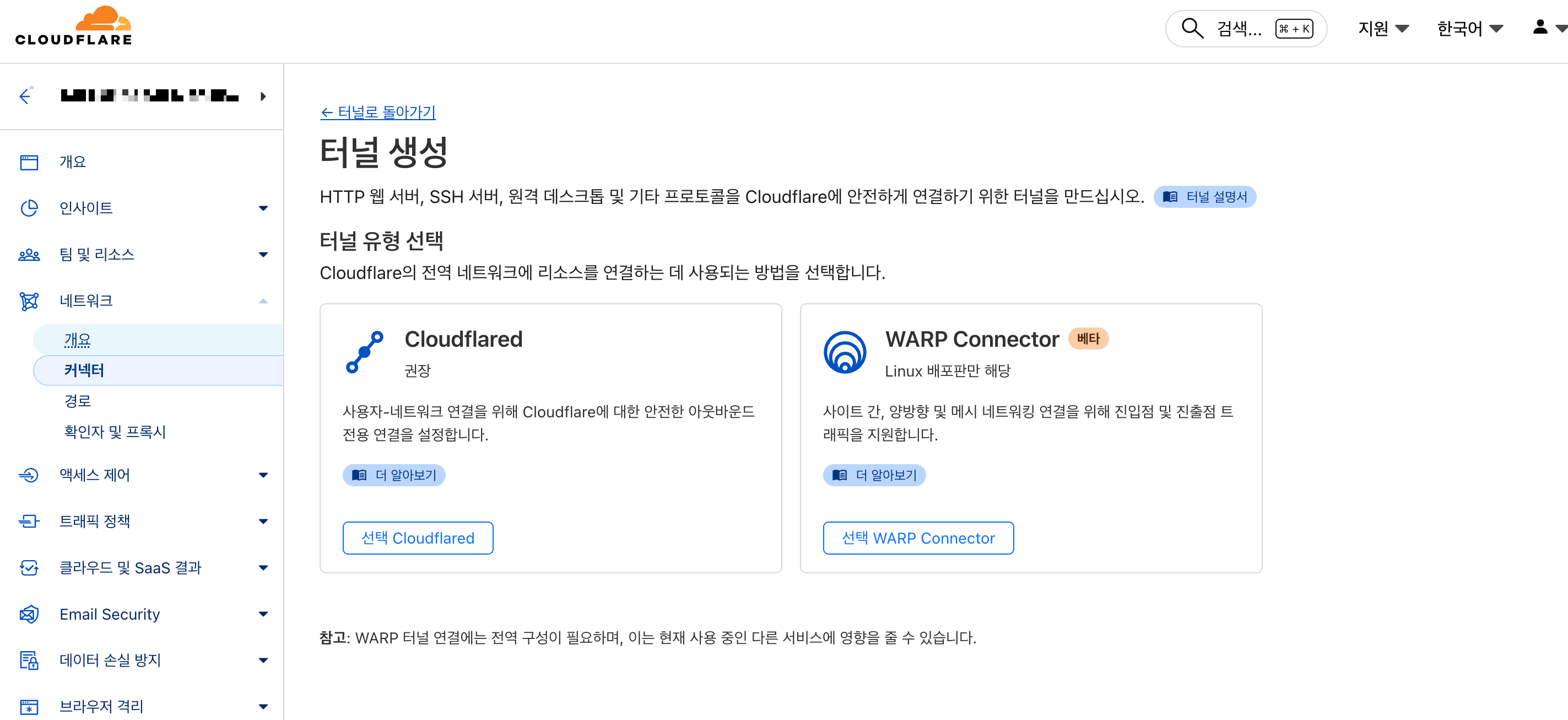 - Cloudflared (좌측) 터널 유형을 클릭(WARP Connector는 뭔지 모름)