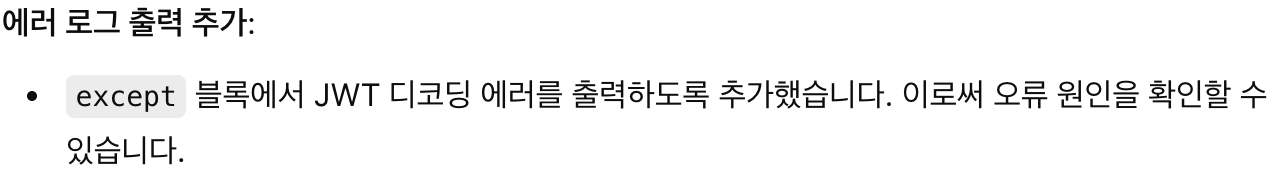 처음 코딩할 때 뭐가 자꾸 안되어서, ChatGPT한테 물어보니, 아래와 같은 답변과 함께, print(f"Error decoding JWT: {e}) 문장을 추가해줬다.